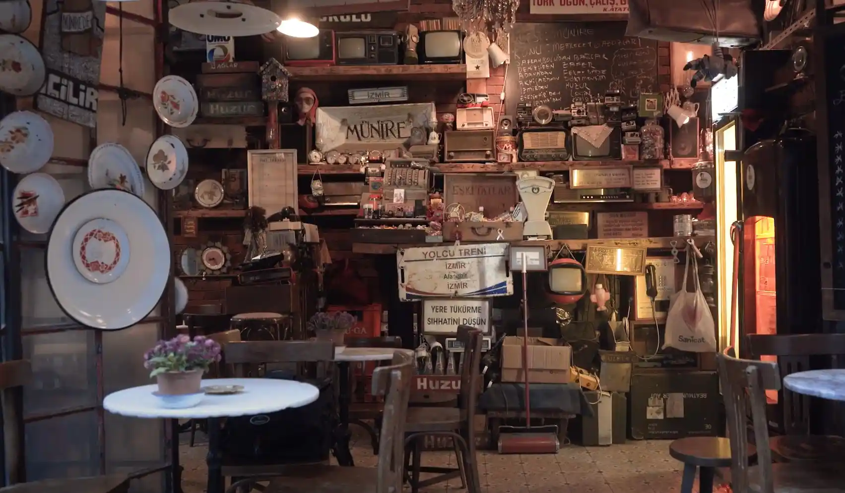 Münire stands out among İzmir’s coffee shops because it has a strong sense of nostalgia and also sells old and antique things. Münire sells 20 different kinds of Turkish gazoz in addition to its excellent Turkish coffee (soda pop).